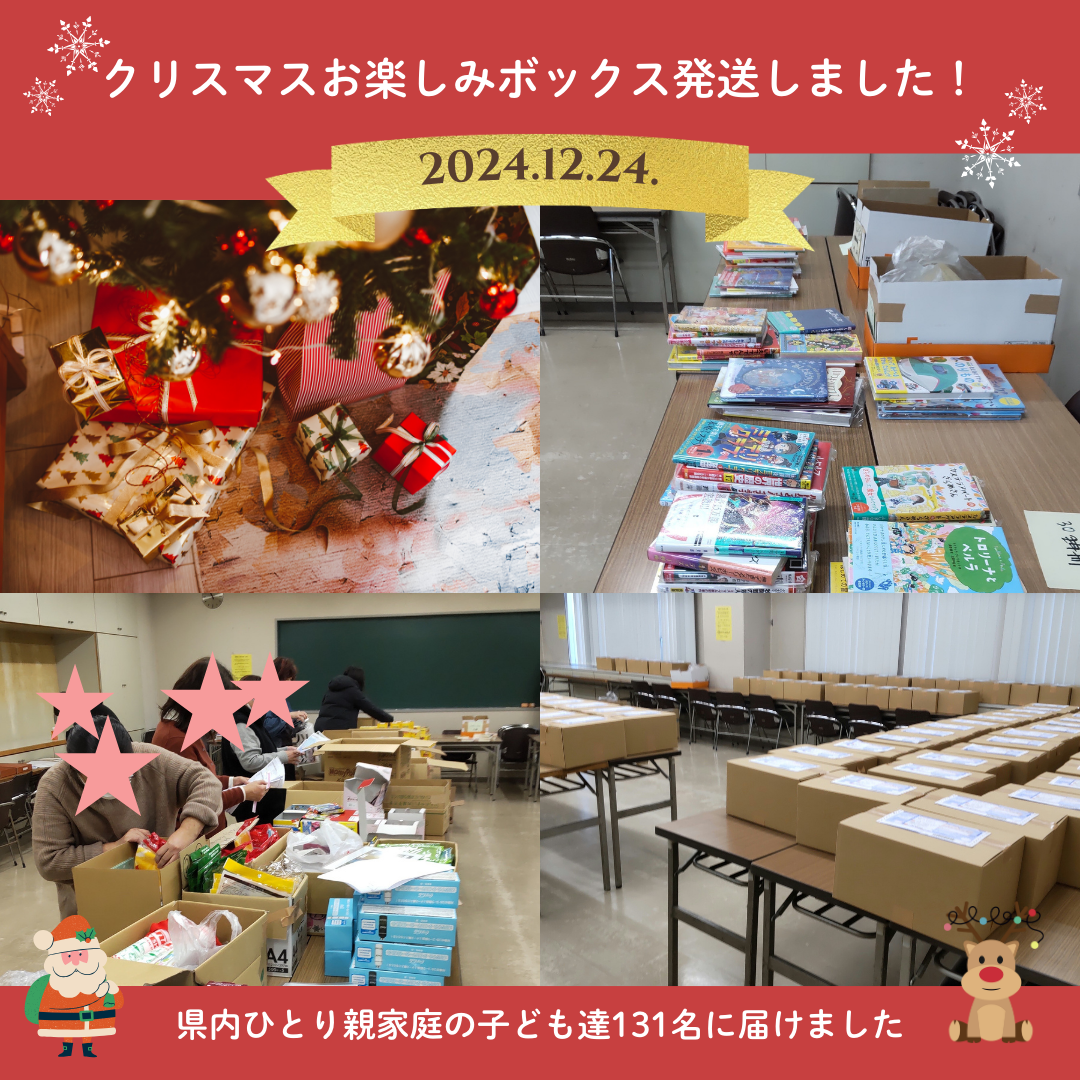 今年も「クリスマスお楽しみボックス」を送りました たくさんの方々のご支援で埼玉県内のひとり親家庭の子ども達(131名)にプレゼントを届けることができました。 ご家族で楽しいひとときを過ごせると良いですね。
