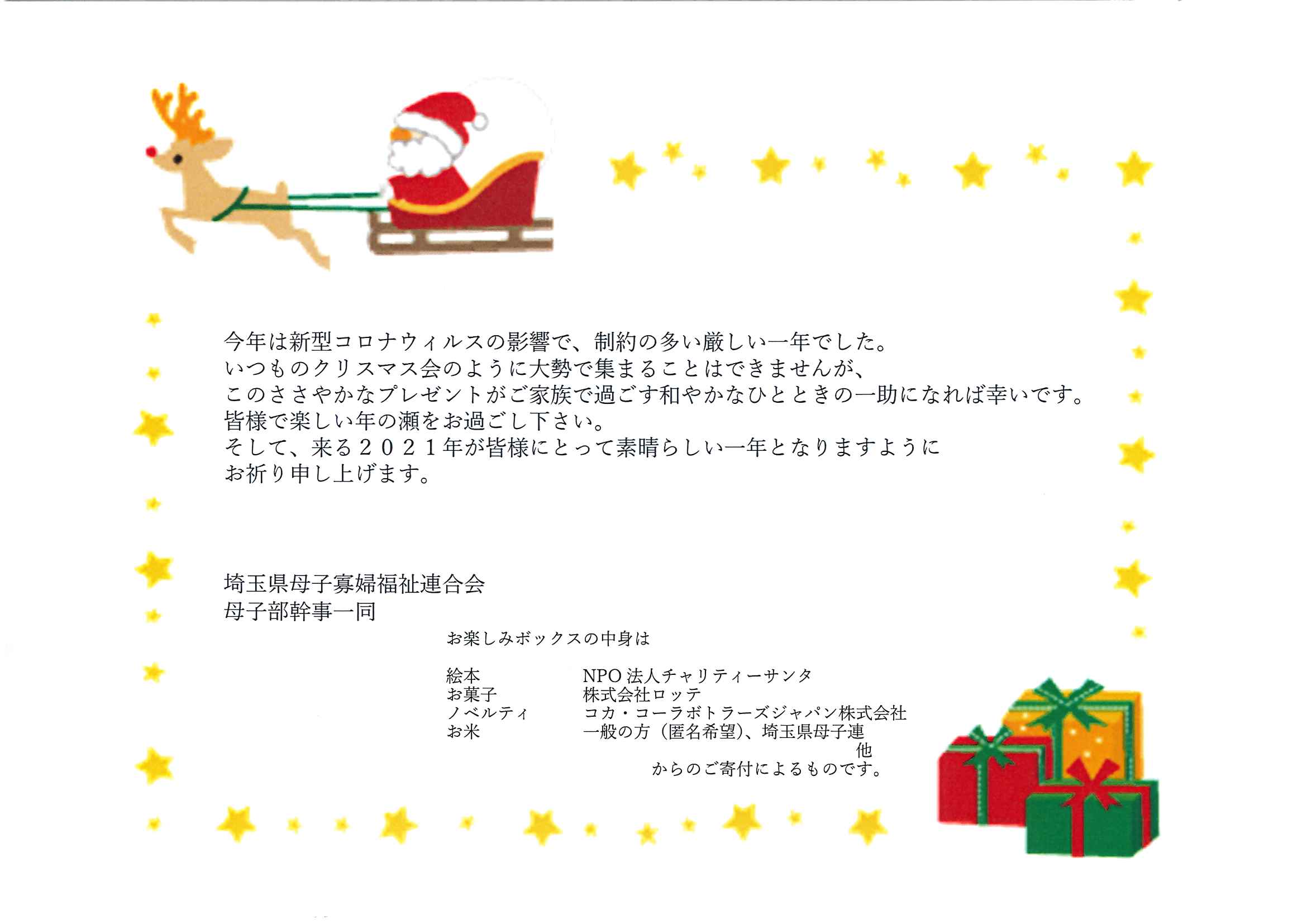 クリスマスお楽しみボックスをサンタさんに代わってお届けしました! 例年開催するクリスマス会が今年はコロナ禍のため開催できなかったので、小学生までのお子さんがいる82家庭に、下記の皆さまからのご寄付の品を詰めて「お楽しみボックス」として贈りました。 *NPO法人チャリティーサンタ様より 絵本 *株式会社ロッテ様より お菓子いろいろ *コカ・コーラボトラーズジャパン株式会社様より ノベルティ *県民の方々より お米 (順不同) いただいたご家庭からお礼のメッセージが届いています。 皆様、本当にありがとうございました。
